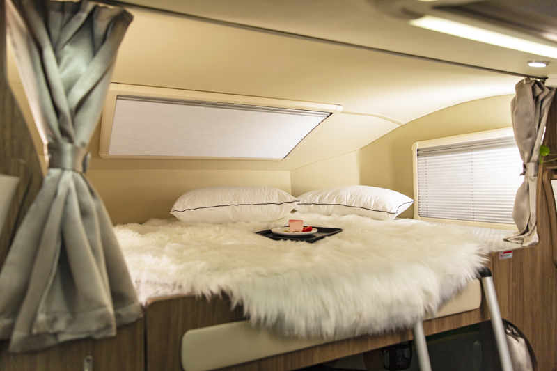 房車后部還有一個縱置床,1900*1240mm,這張床確實要更方便很多,尤其是帶老人孩子出行,不方便到額頭床,后部這張雙人床就是不錯的休息選擇,當然兩口出行也可以選擇休息在下部的縱置床喲。
