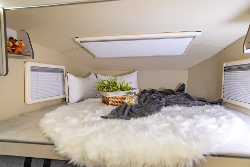 生活區額頭大床1950*1700mm,休息兩人十分寬敞。額頭床三面環窗,左右對開以及頂部可開啟天窗搭配一起,通風好、采光棒,躺平更舒服。額頭床左右兩側各配有閱讀燈、儲物格、充電插口,晚上手機充電、看書、看手機更方便,不會因此影響家人休息。